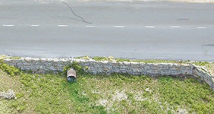 Use a straw or corrugated aluminum to represent drainage culverts. the don't have to go all the way through. Just give the illusion. These culverts are just laying in front of the wall. The weeds and vines growing over and around the culvert adds to the illusion that they go under the road. Add a bit of rust for a final touch.