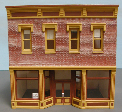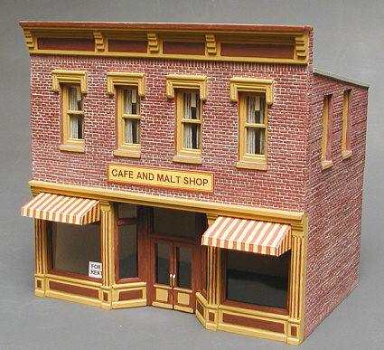 Cruising Main, Style 1... Finally!... Storefronts in true S-scale. Currently in stock. Now 5 versions of style 1 to choose from. Now you can mix and match to make a very large building or just several small ones. Typical brick store structures that can be used for anything you wish. Available as complete structure kits with front, back and side walls cast in high quality polyurethane resin. These kits also include a styrene sheet for roofing, clear styrene sheet for window glass, a brick chimney, curtains, signs and awnings. Click here to see how easy it is to build these kits.