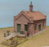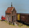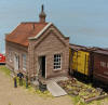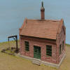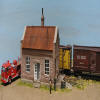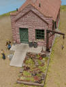 | Machine Shop 1/64 scale Currently out of stock. The overall footprint including steps, deck and ramp is 9-1/2 x 4-3/8 inches. The junk pile, which an be located as desired is 3-1/2 x 2-1/8 inches. If you locate the junk pile as shown in the photo, the overall dimension is 11-1/4 inches long. To add flexibility, the kit can be built with the deck and ramp on either the left end or right end of the structure. This kit includes the Jib crane kit and 4 trash cans as shown. Figures, fire engine and train cars are not included. They are for proportional reference only. This kit also includes a bottle of grout solution for brickwork and full color painting and assembly instructions with many modeling tips. To add even more flexibility, you have the choice of either tile roof or corrugated steel roof. This structure can be used as a machine shop, oil shed, maintenance building or whatever you desire. To recommended glue for this kit. Machine Shop - Tile Roof, Kit # 625. Machine Shop - Corrugated Steel Roof, Kit #626. Click on images for large photos. Use your browser back-up button to return.
